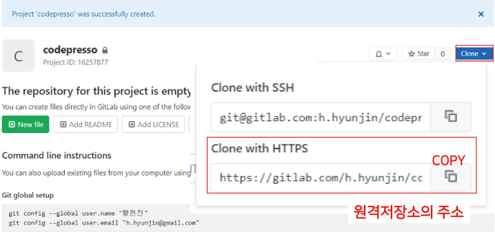 - $git remote add origin 'https://gitlab.com/~~~/codepresso.git'