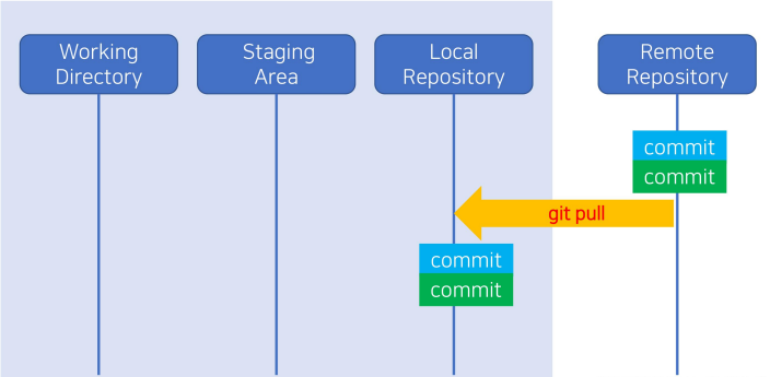 - 원격 저장소에 있는 다른 개발자의 커밋들을 받아온다.