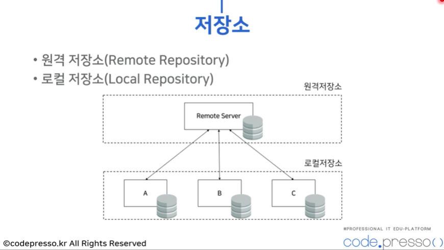 - 원격 저장소(Remote Repository): 파일이 원격 저장소 전용 서버에서 관리되며 여러 사람이 함께 공유하기 위한 저장소이다.
