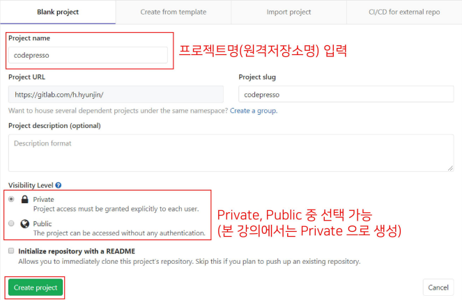 GitLab에서 프로젝트를 생성하여 원격 저장소를 생성한다.