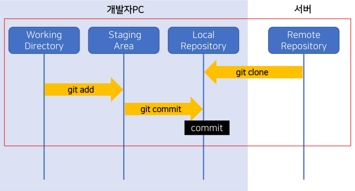 - 로컬 저장소(Local Repository): 각각의 개발자들이 개발하는 PC에 파일이 저장되는 개인 전용 저장소이다.