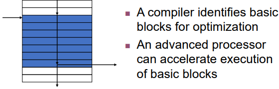 이렇게 분기 명령어로 끝나는 명령어 시퀀스는 컴파일러에게 특히 중요한 의미가 있기 때문에 basic block이라는 별칭이 붙어 있다. basic block이란 분기 명령을 포함하지 않으며 분기 목적지나 분기 레이블도 없는 시퀀스이다. 컴파일러의 초기 단계 작업 중 하나는 프로그램을 basic block으로 나누는 일이다.