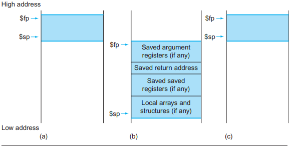 프레임 포인터($fp)는 프레임의 첫 번째 워드를 가리키며, 스택 포인터($sp)는 스택의 맨 위를 가리킨다. 프로시저를 호출하면 저장된 모든 레지스터와 메모리 상주 지역 변수를 넣기 위한 공간을 스택에 만든다. 스택 포인터는 프로그램이 실행되면서 변할 수 있으므로 변수 참조는 변하지 않는 프레임 포인터를 사용하는 것이 좋다. 스택 포인터를 사용해도 약간의 주소 계산이 추가되면 변수 접근이 가능하다. 스택에 지역 변수를 저장하지 않는 프로시저의 경우 프레임 포인터 값을 바꾸고 나중에 복구하는 일을 생략함으로써 시간을 절약한다. 프레임 포인터를 사용하는 경우는 호출할 때의 $sp 값으로 $fp를 초기화하고 나중에 $fp로 $sp를 복구한다.