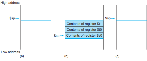 방법은 값이 보존되어야 할 모든 레지스터를 스택에 넣는 것이다. Stack Pointer $sp는 스택에 저장되는 레지스터 개수에 맞추어 조정된다. 복귀한 후에는 메모리에서 값을 꺼내 레지스터를 복구하고 이에 맞추어 $sp를 다시 조정한다.