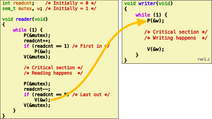 - mutex Semaphore는 현재 Critical Section에 있는 Readers 수를 세는 공유 변수 readcnt에 대한 Access를 보호한다.