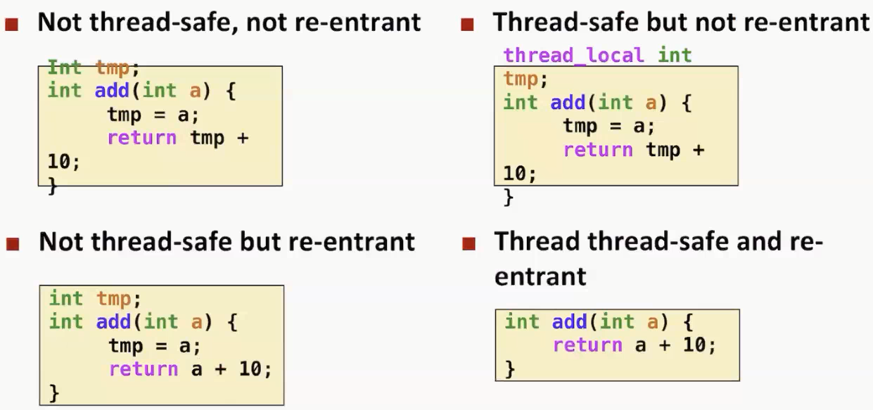 여러 Thread로 호출될 때 공유 변수에 Access하지 않는 경우에만 Reentrant하다.