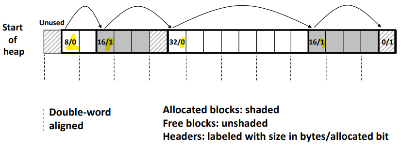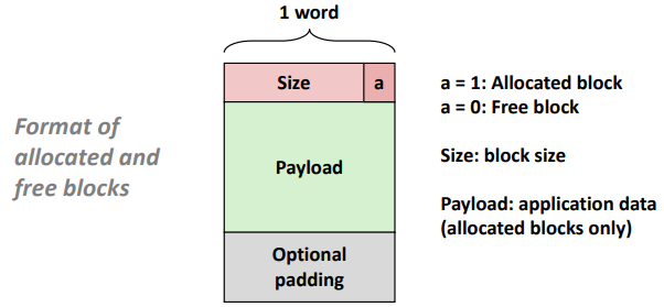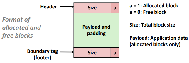 Allocator는 Heap을 다양한 크기의 Block들의 모음으로 유지한다. 각 Blcok은 할당되거나 사용 가능한 가상 메모리의 연속적인 Chunk이다. 할당 된 Block이 프로그램에서 사용하도록 명시적으로 예약되어있다. Free Block은 사용 가능한 Block이다. 사용 가능한 Block은 응용 프로그램에 의해 명시적으로 할당될 때까지 사용 가능한 상태로 유지된다. 할당된 Block은 프로그램에 의해 명시적으로 또는 Memory Allocator 자체에 의해 암묵적으로 해제될 때까지 할당된 상태로 유지된다.