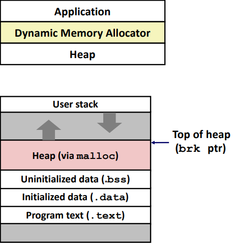 Dynamic Memory Allocator(mallc)는 Heap이라는 가상 메모리 영역을 관리한다. 세부 정보는 시스템마다 다르지만 일반성의 손실 없이 Heap은 초기화되지 않은 Data 영역 전후에서 시작되어 위로 확장되는 demand-zero memory라고 가정한다. 각 프로세스에 대해 Kernel은 Heap의 상단을 가리키는 변수 brk("break")를 유지한다.