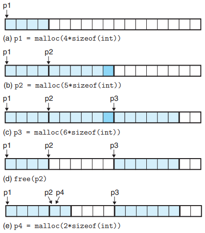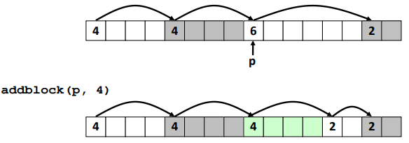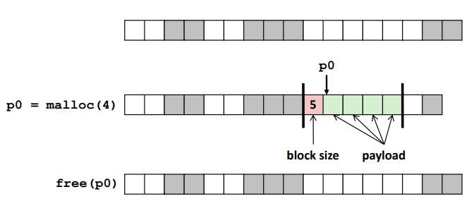 - malloc(p) p byte 만큼의 payload를 갖는 block을 할당받는다.