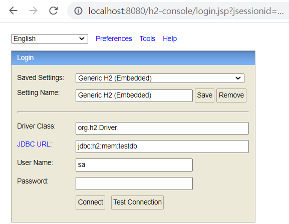 그 다음 메인 메서드를 하여 localhost:8080/h2-console로 접속하면 다음과 같이 웹 콘솔 화면이 나타난다.