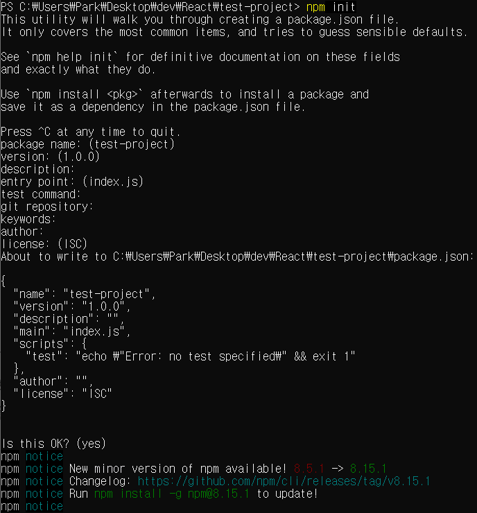 이 정보를 입력하면 프로젝트의 메타데이터가 담긴 pcakage.json 파일을 만들어 준다.