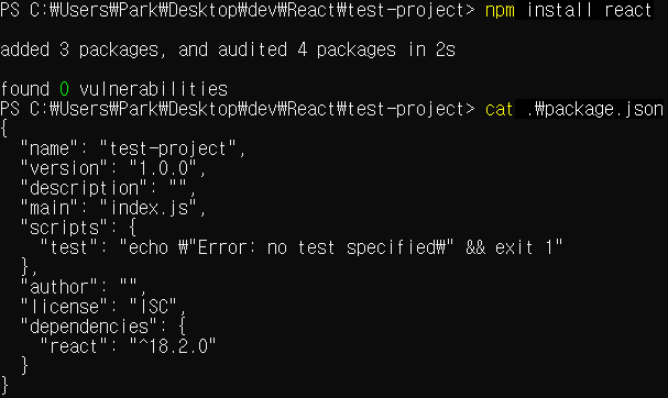 예를 들어 아래와 같이 npm을 이용해 react를 설치했다고 가정하자.