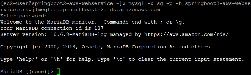 설치가 다 되었다면 로컬에서 접근하듯이 계정, 비밀번호, 호스트 주소(RDS 엔드포인트)를 사용해 접속한다.
