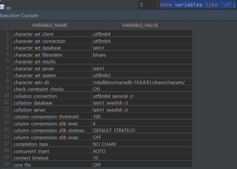 RDS에서 설정한 utf가 잘 적용되었는지 확인해보자.