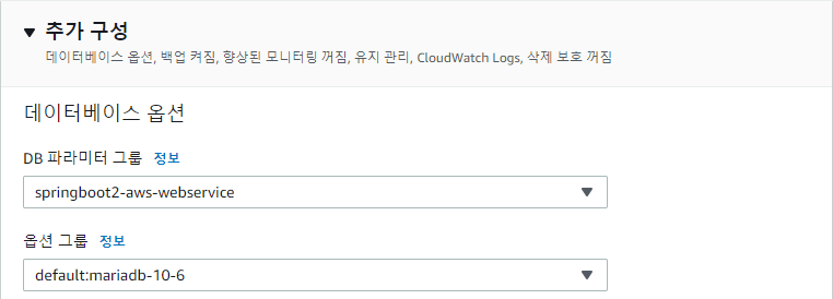 - 하단의 추가 구성에서 DB 파라미터 그룹을 변경한다.
