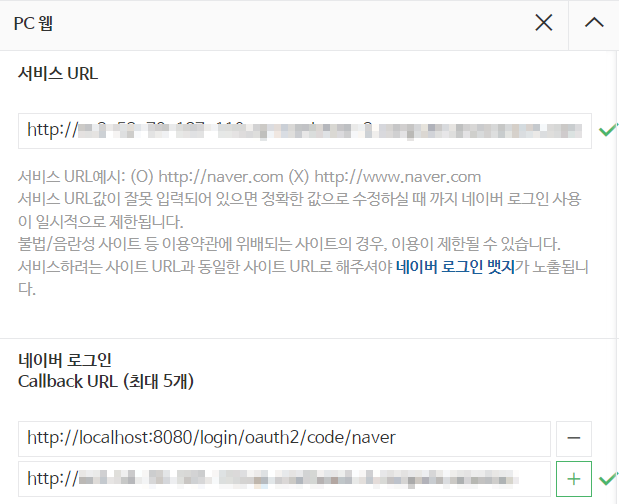 PC 웹 항목의 서비스 URL과 Callback URL에 EC2 퍼블릭 DNS 주소를 등록한다.