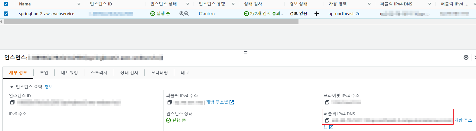 EC2 인스턴스를 선택하면 상세 정보에서 퍼블릭 DNS를 확인할 수 있다.