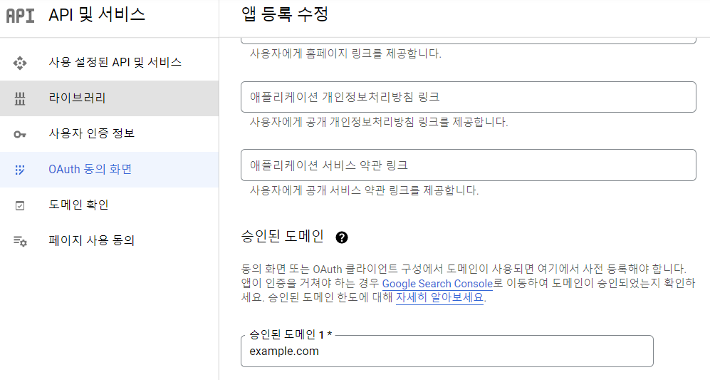OAuth 동의 화면 탭으로 이동해서 앱 등록 수정에 들어간다.