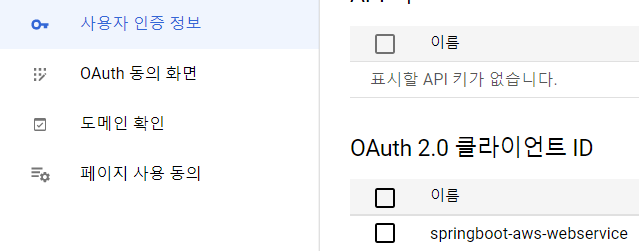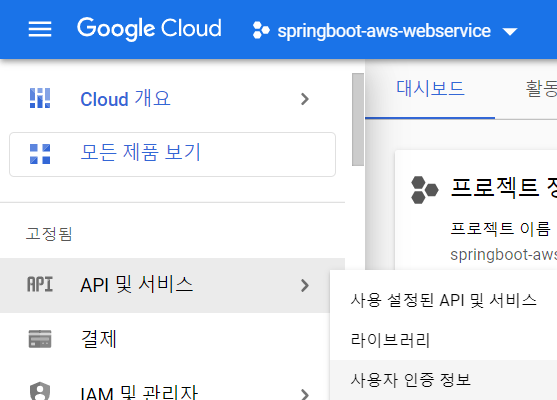 구글 웹 콘솔에 접속하여 사용자 인증 정보로 이동한다.