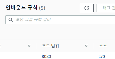 EC2에 스프링 부트 프로젝트가 8080 포트로 배포되었으니 8080포트가 보안 그룹에 열려 있는지 확인한다.