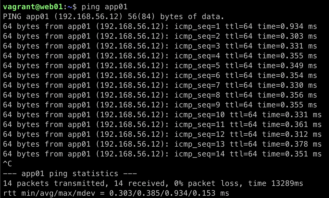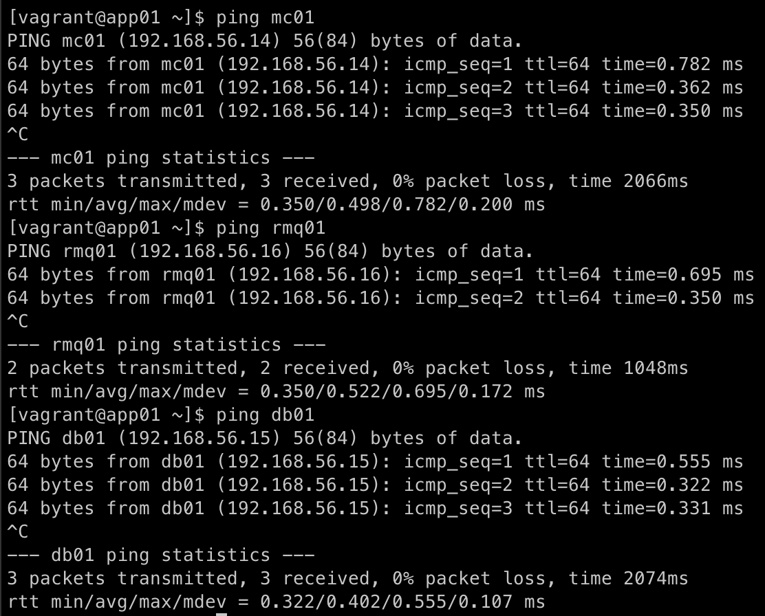 app01에 로그인하여 다른 VM들에 ping을 보낼 수 있는지 확인한다.