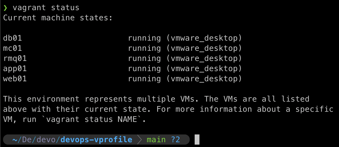 vagrant status 명령어로 설치된 VM들을 확인한다.