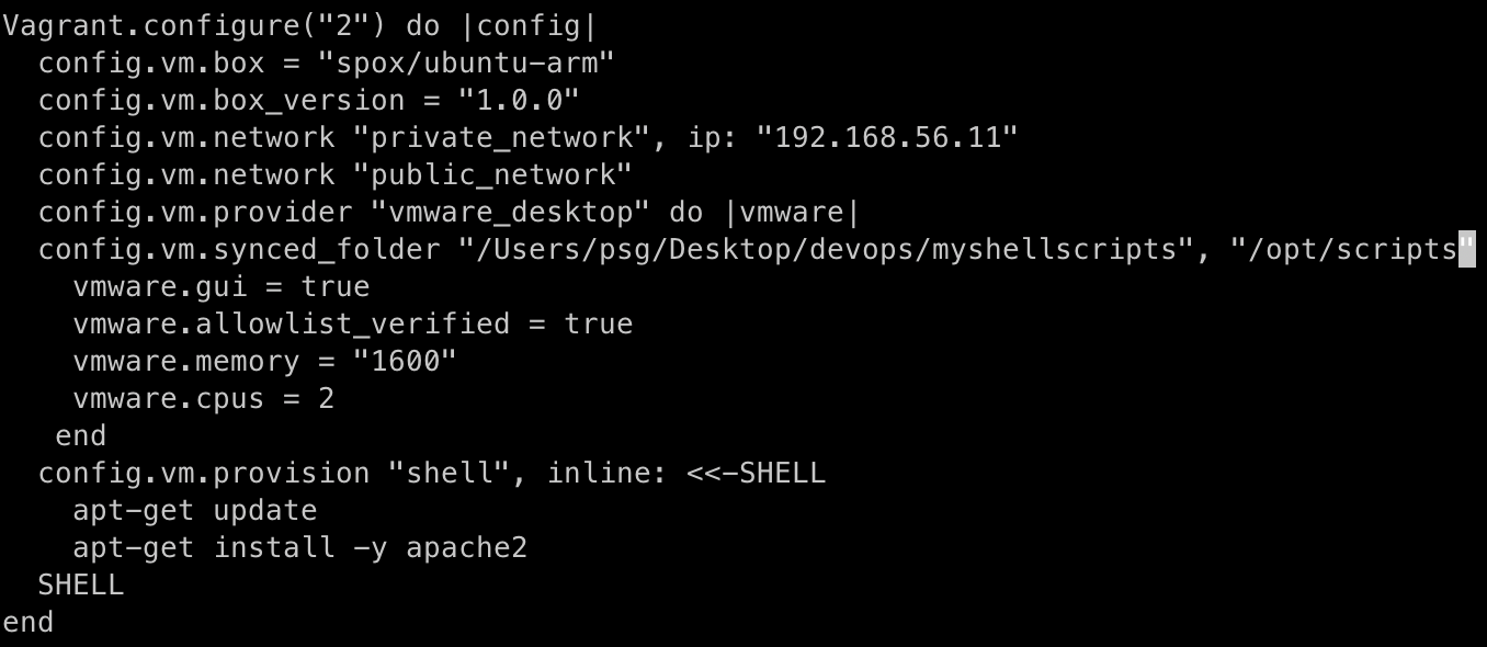 - provision 섹션에 가상 머신을 설치하고 실행 할 명령어를 작성한다.