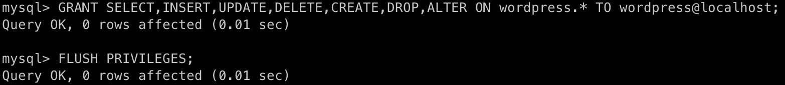 mysql> GRANT SELECT,INSERT,UPDATE,DELETE,CREATE,DROP,ALTER ON wordpress.* TO wordpress@localhost;