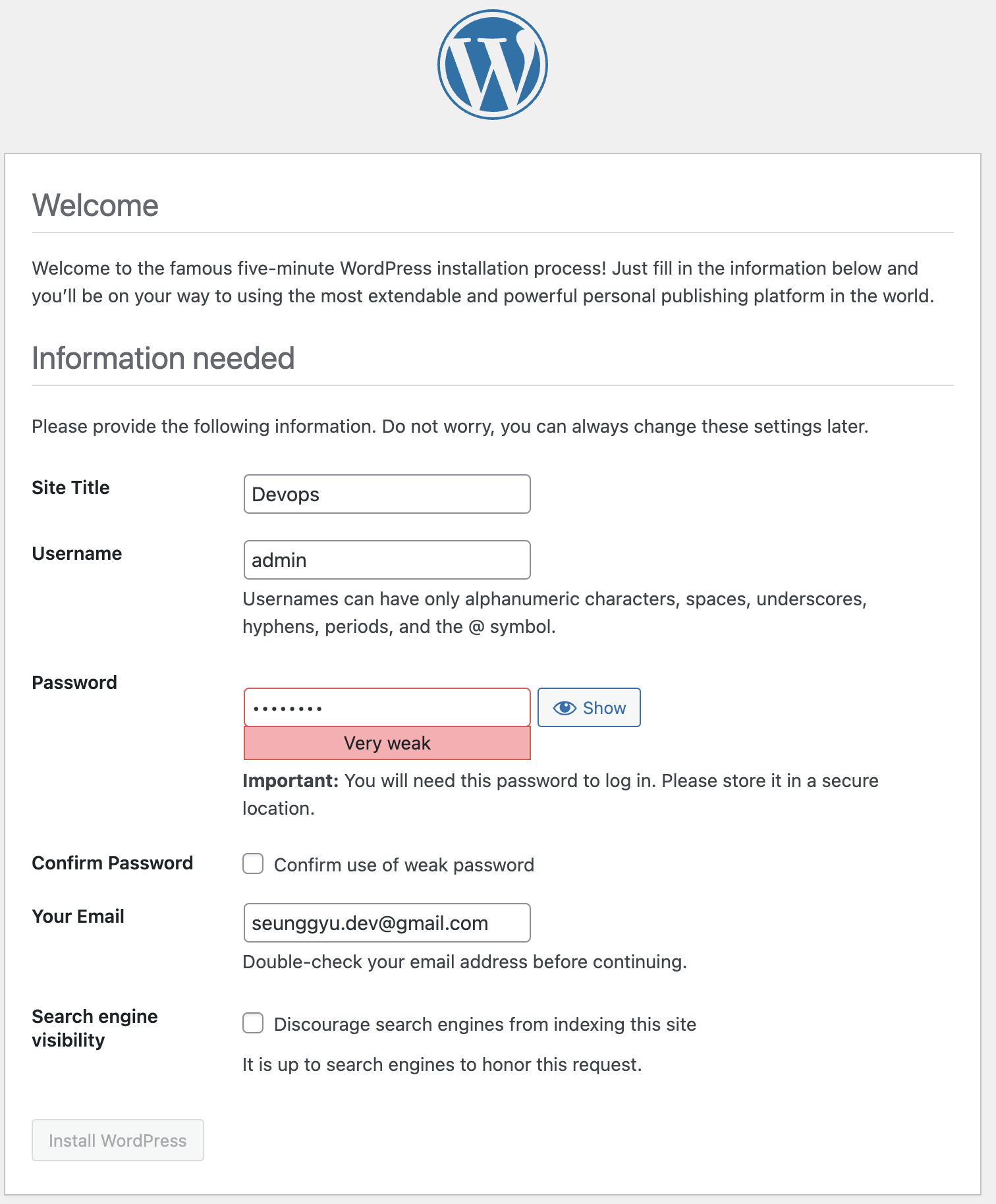 이제 이 데이터베이스를 사용하도록 WordPress를 구성한다.