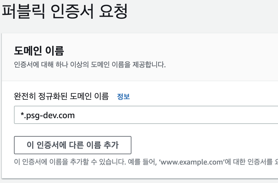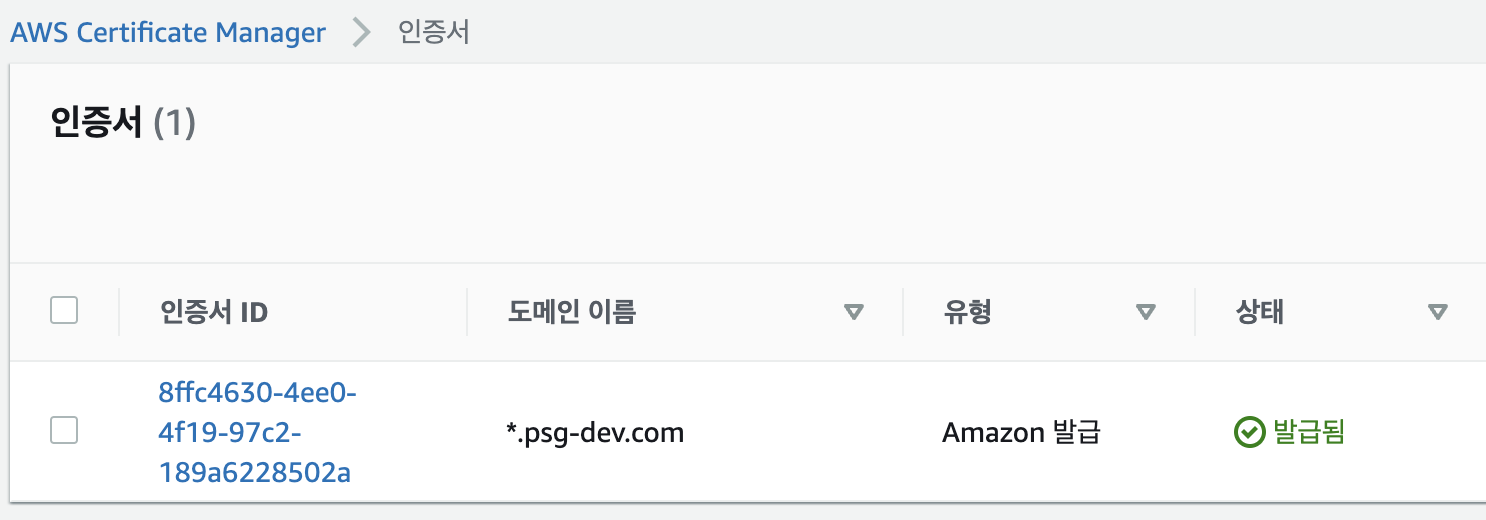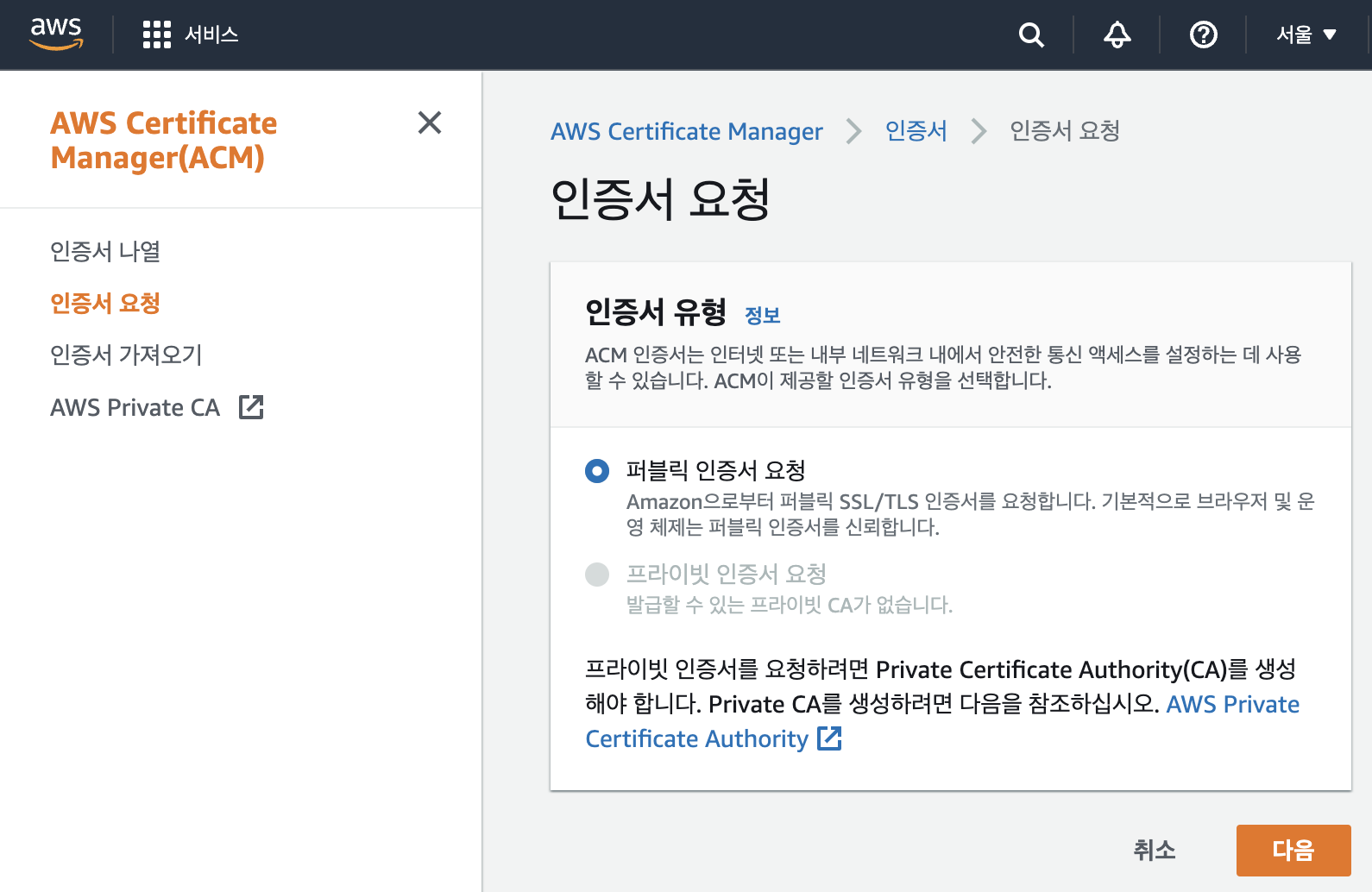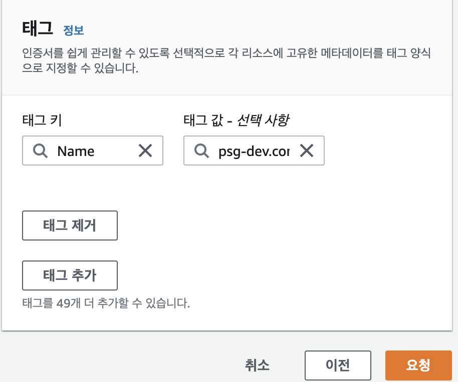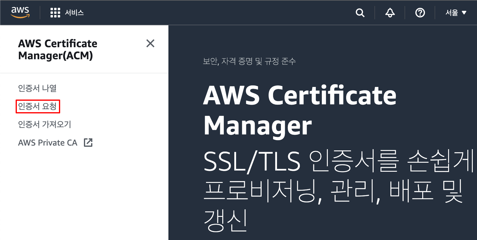 1. AWS Certificate Manager(ACM) 이동 -> 인증서 요청