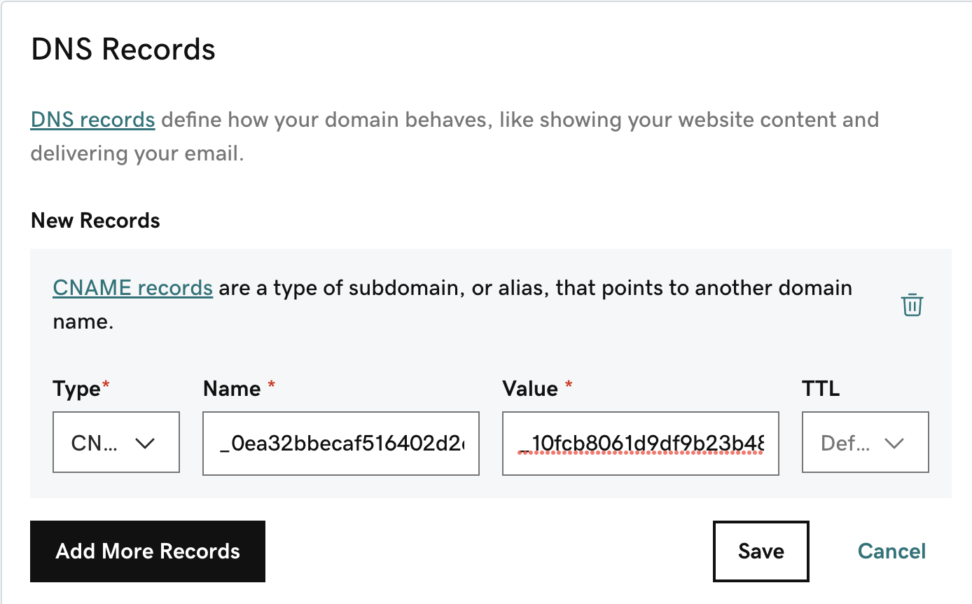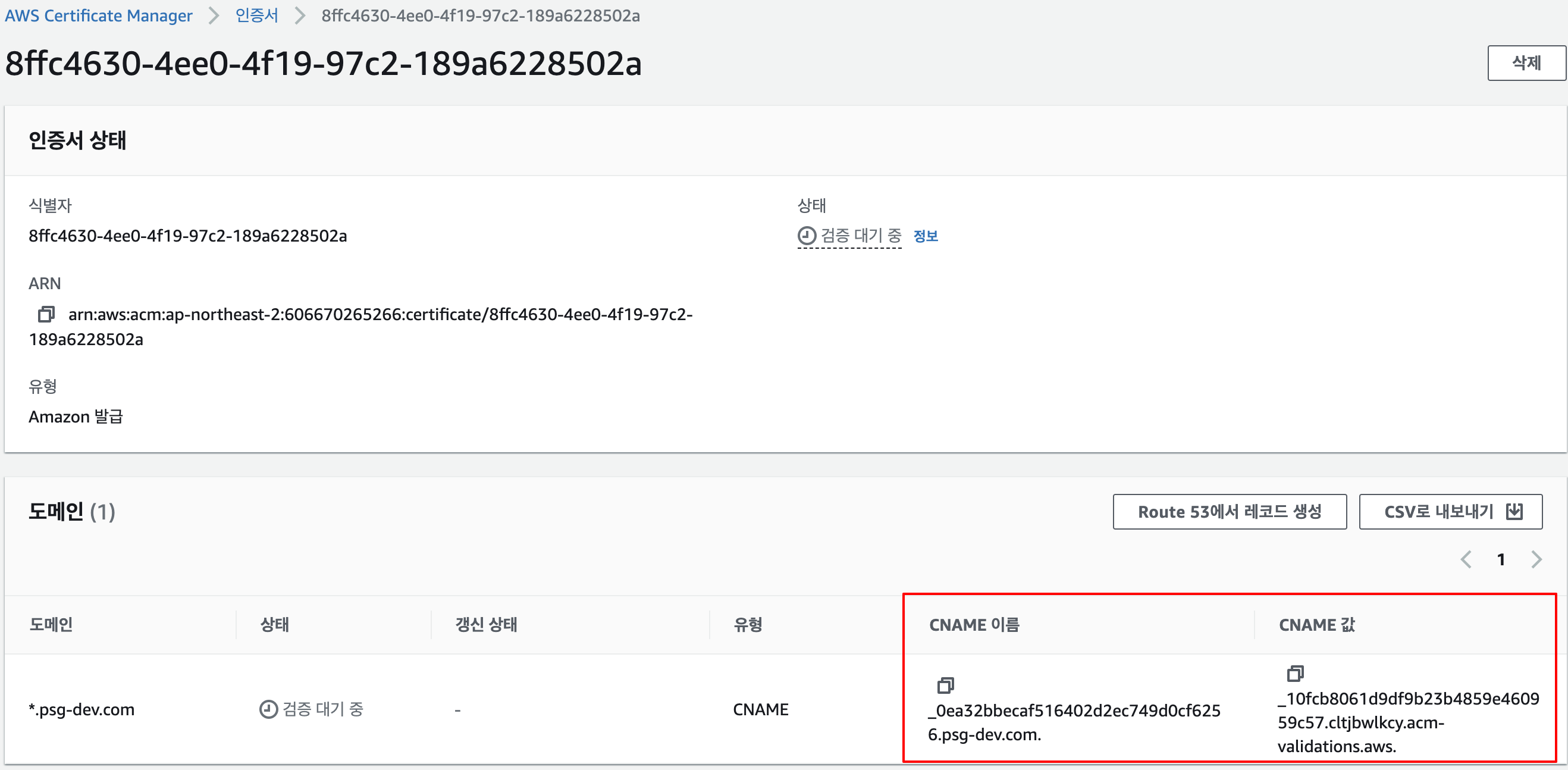 8. 생성한 인증서의 도메인 CNAME 값을 DNS 레코드에 추가한다. 이후, 유효성 검사를 하는 동안 시간이 조금 걸릴 수 있다.