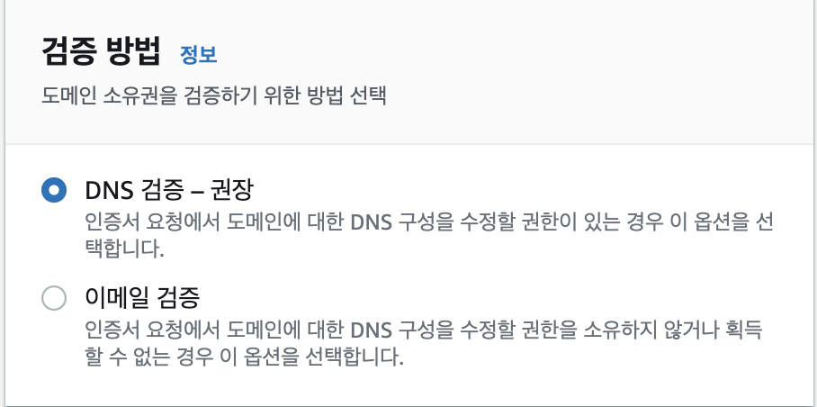 4. 검증 방법은 DNS가 가장 빠르므로 DNS를 선택한다.