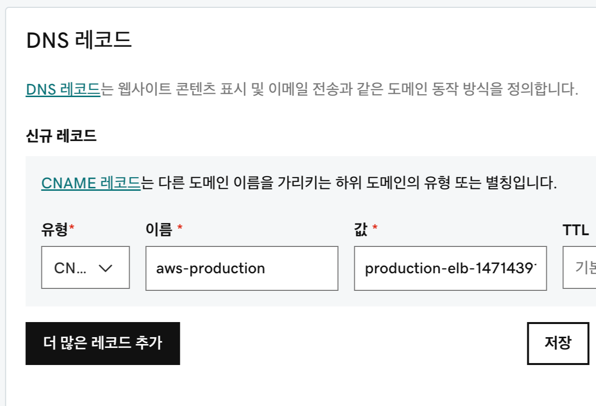 - 생성된 DNS name을 구매한 도메인 업체의 DNS 레코드에 추가하기.