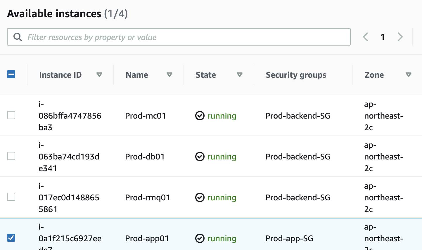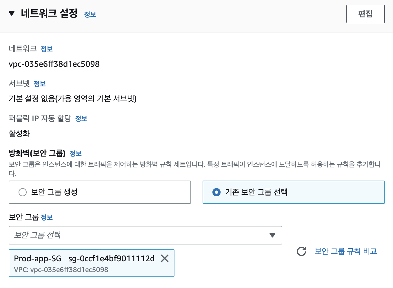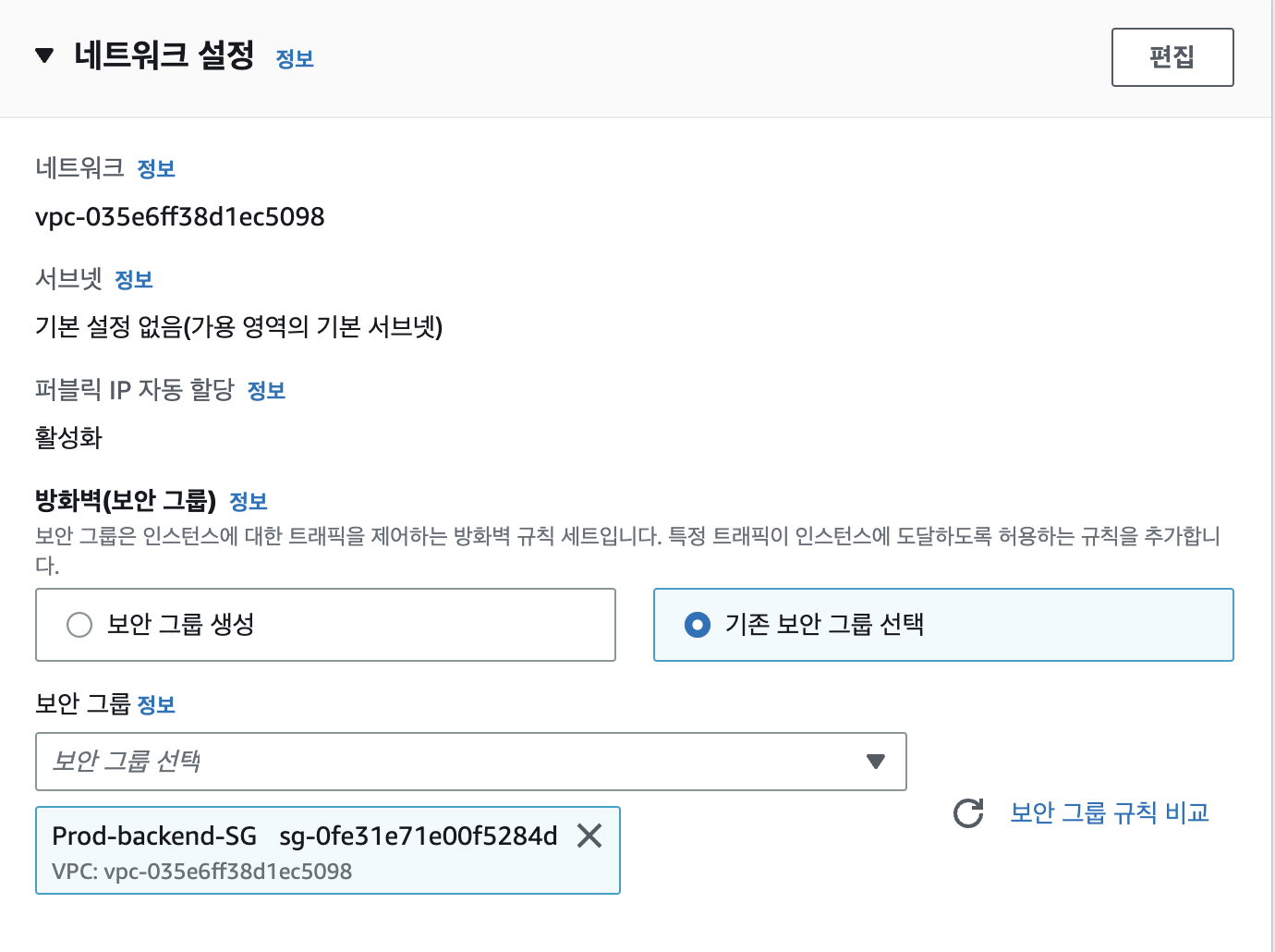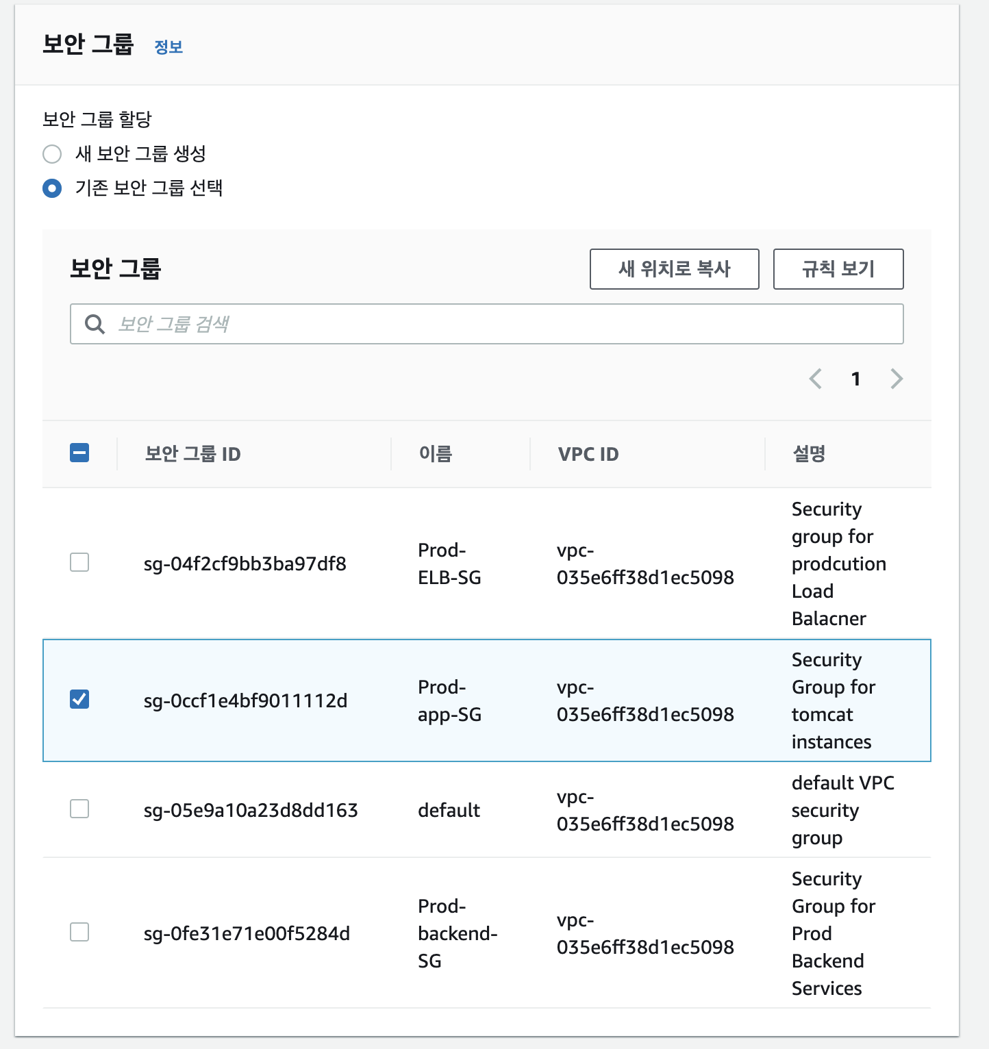 - 기존 보안 그룹 선택