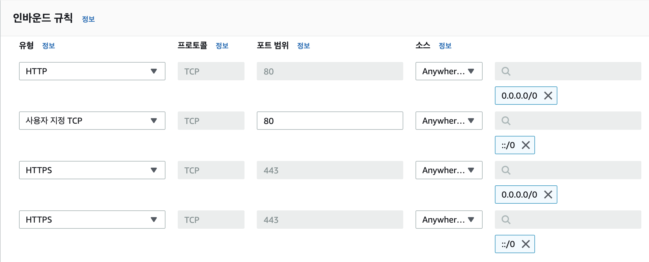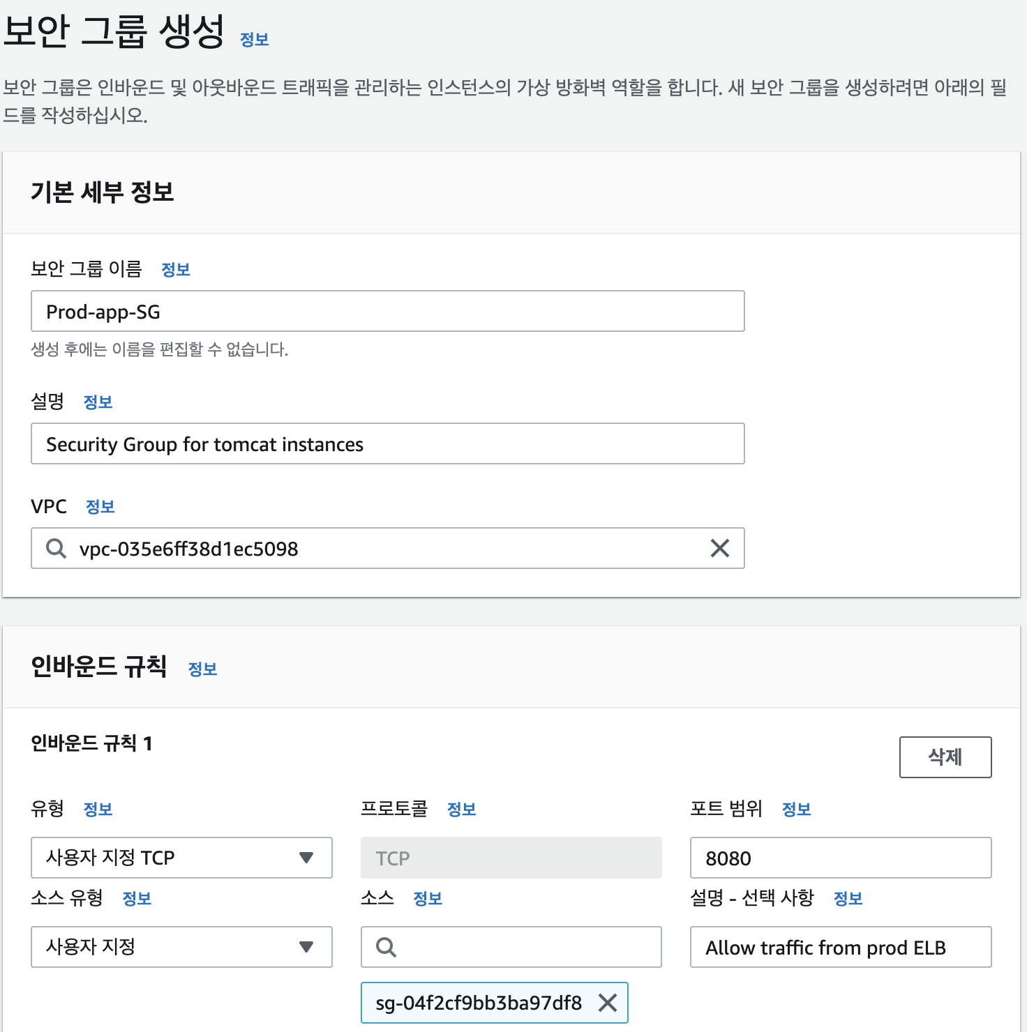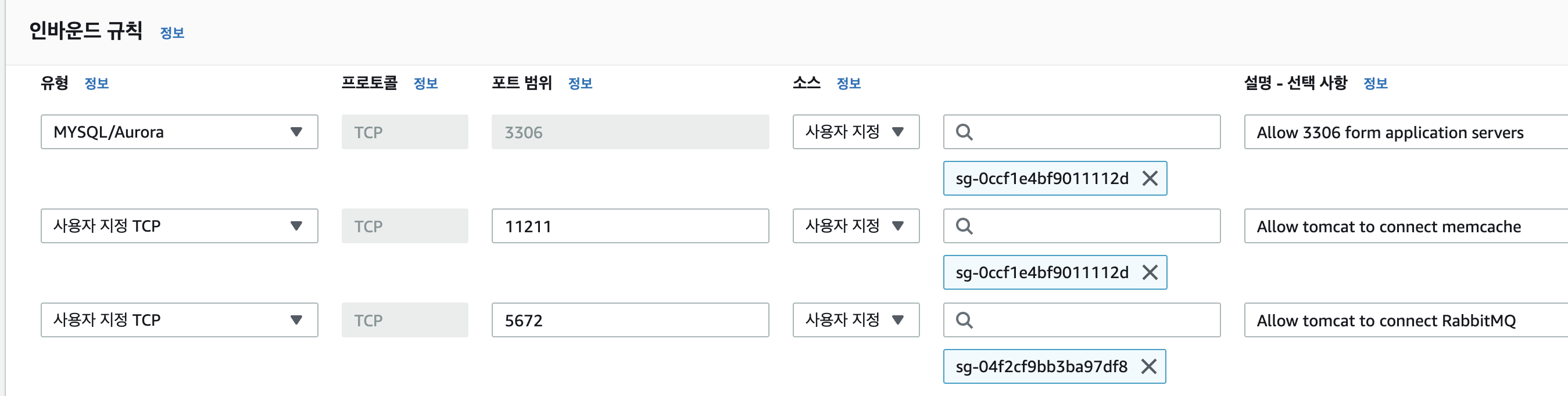 백엔드 서비스들이 tomcat에 접근할 때 위 포트를 사용하므로 인바운드 규칙에 추가해 준다.