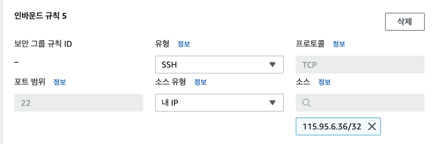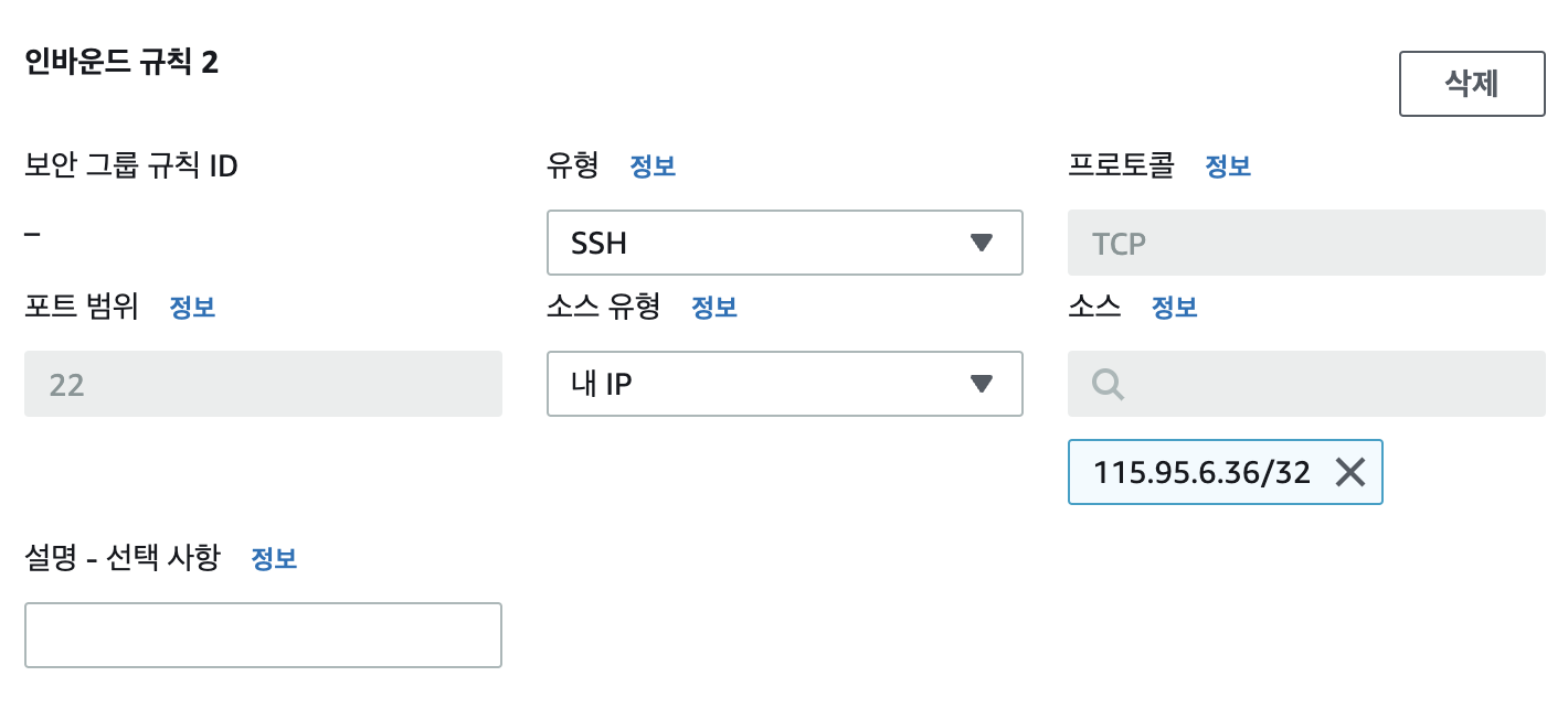 - 생성된 인스턴스에 ssh로 로그인하기 위해 보안 그룹에서 22번 port를 인바운드 규칙에 추가해 준다.