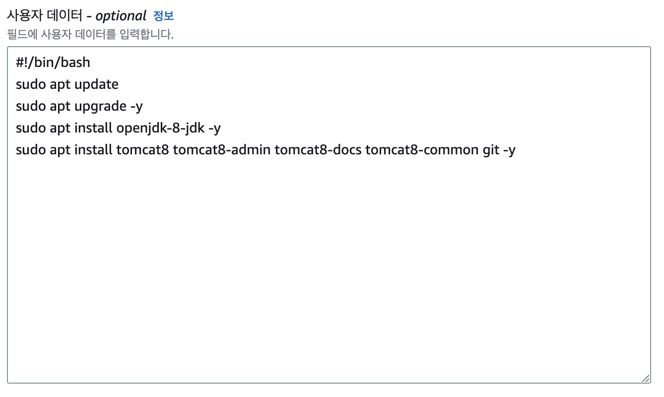 - EC2 가상 머신이 생성되면서 이곳에 작성된 명령어들을 수행하며 provisioning 된다.