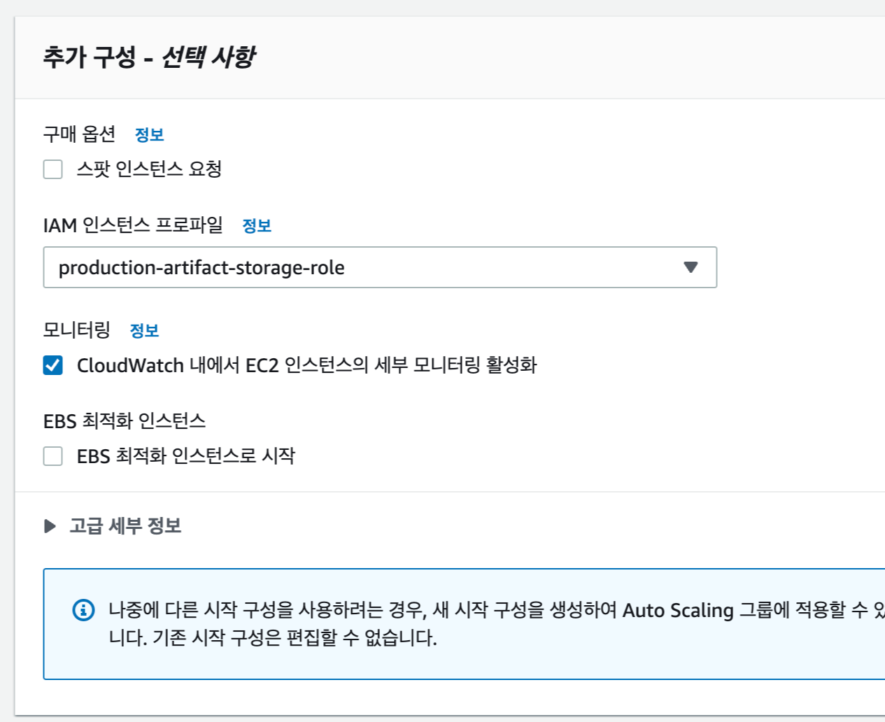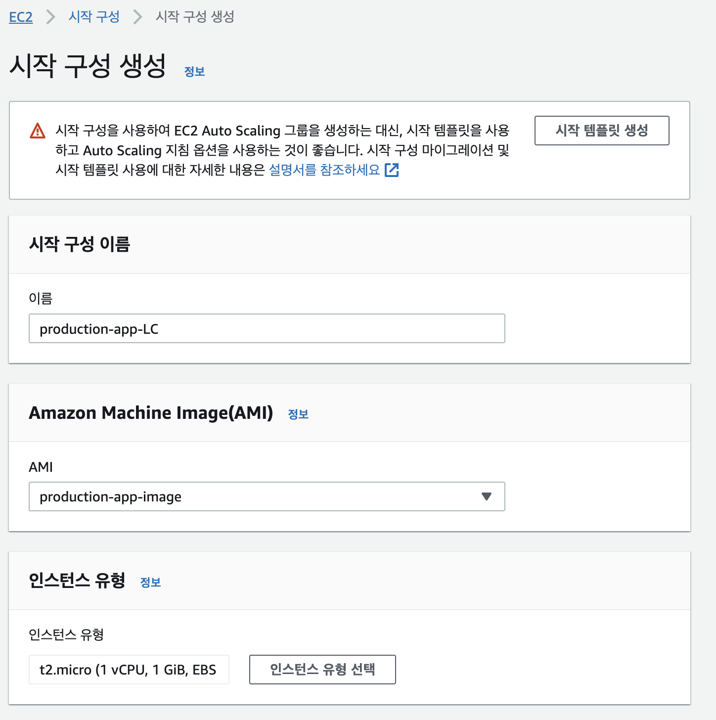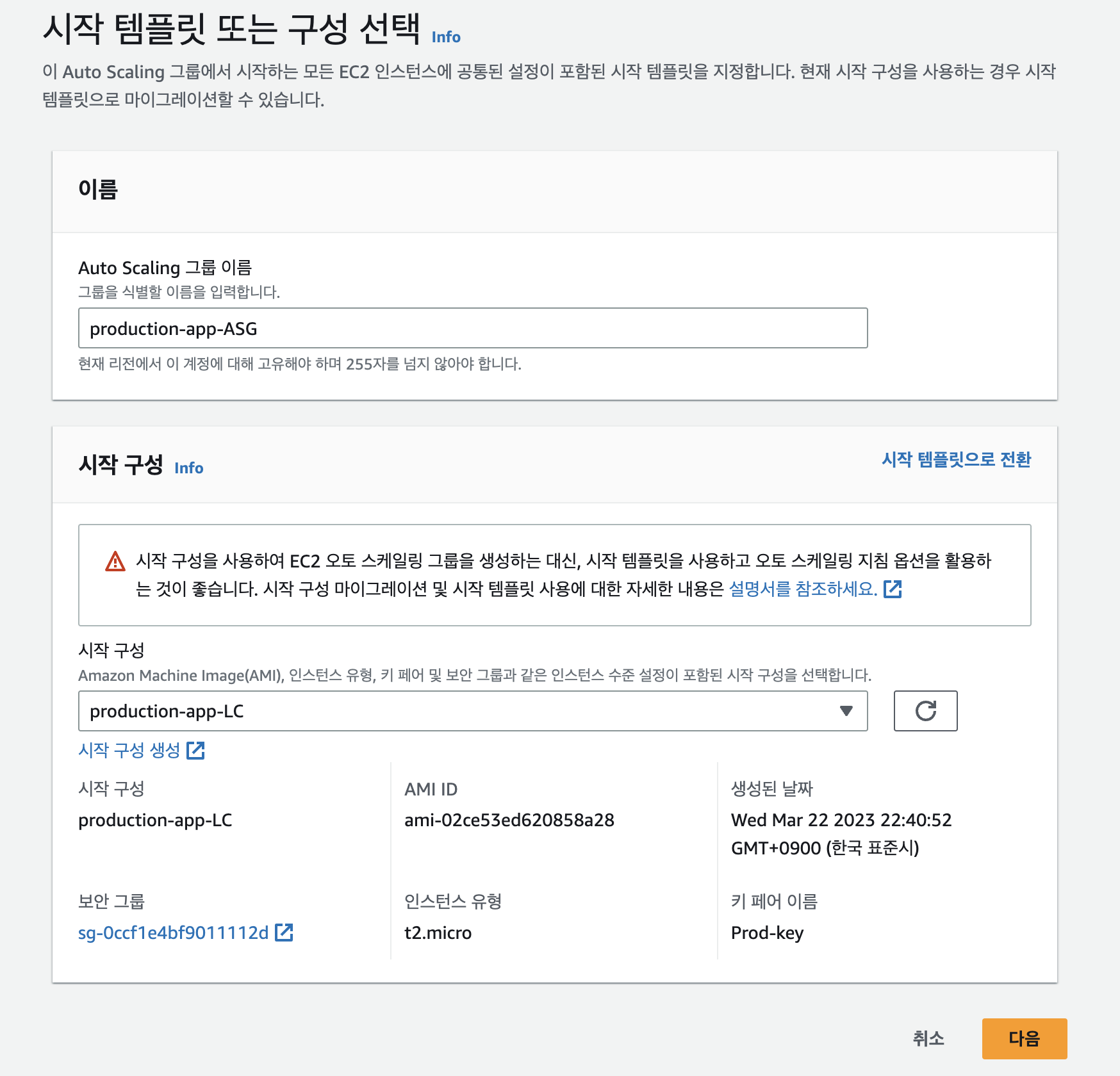 Auto scaling 탭의 시작 구성 - 시작 구성 생성