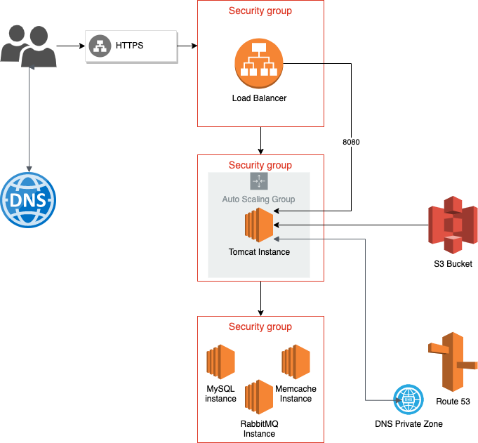 - EC2 - Tomcat, Mysql, Memcached, RabbitMQ