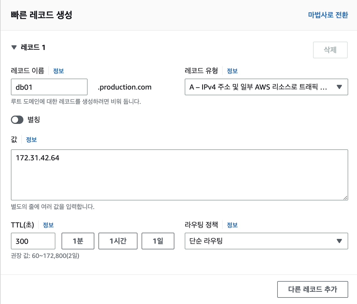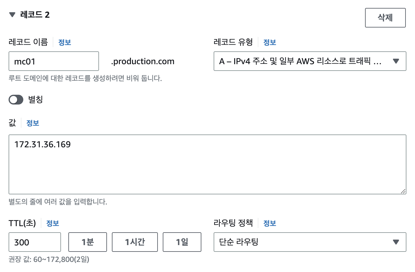 - IP 주소로 접근하는 것이 아니라 Route 53에서 DNS 레코드를 추가하여 주소로 백엔드 서버에 접근할 수 있도록 한다.