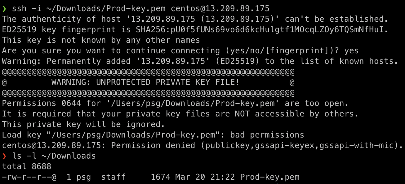 - key의 권한 에러가 발생하면 권한을 수정하고 다시 실행하면 정상적으로 로그인된다.