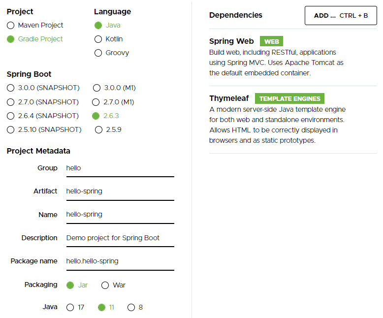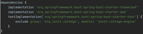 dependencies에 추가한 라이브러리는 spring-boot-starter-thymeleaf와 spring-boot-starter-web인데