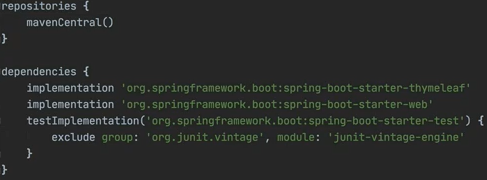 mavenCentral이라는 사이트에서 다운로드할 수 있도록 respositories { mavenCentral() } 이 필요하다.