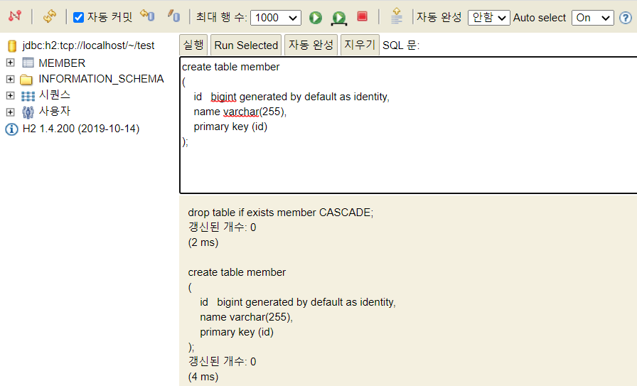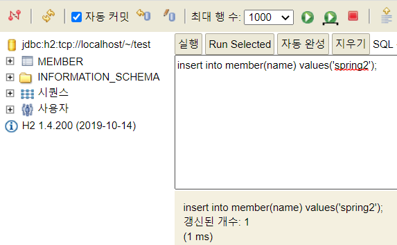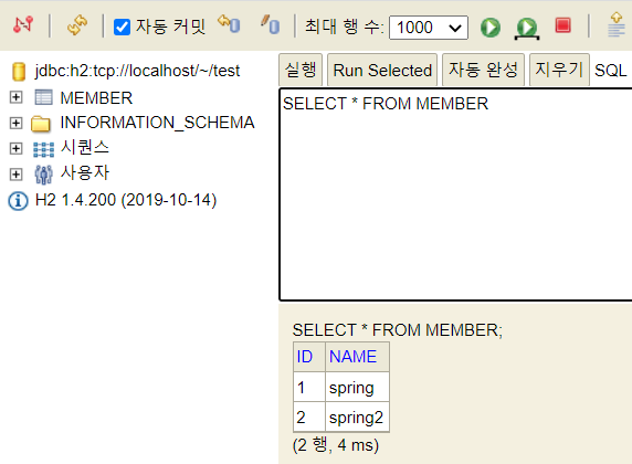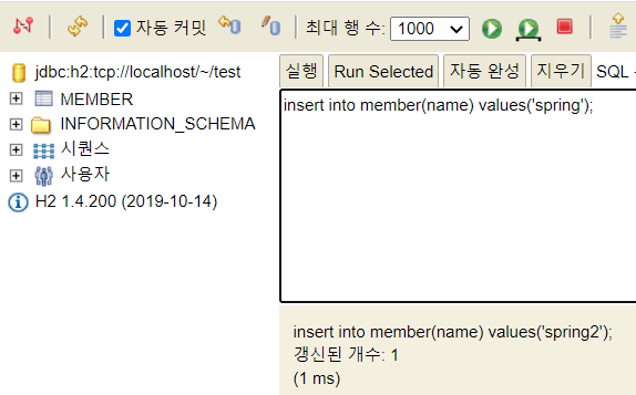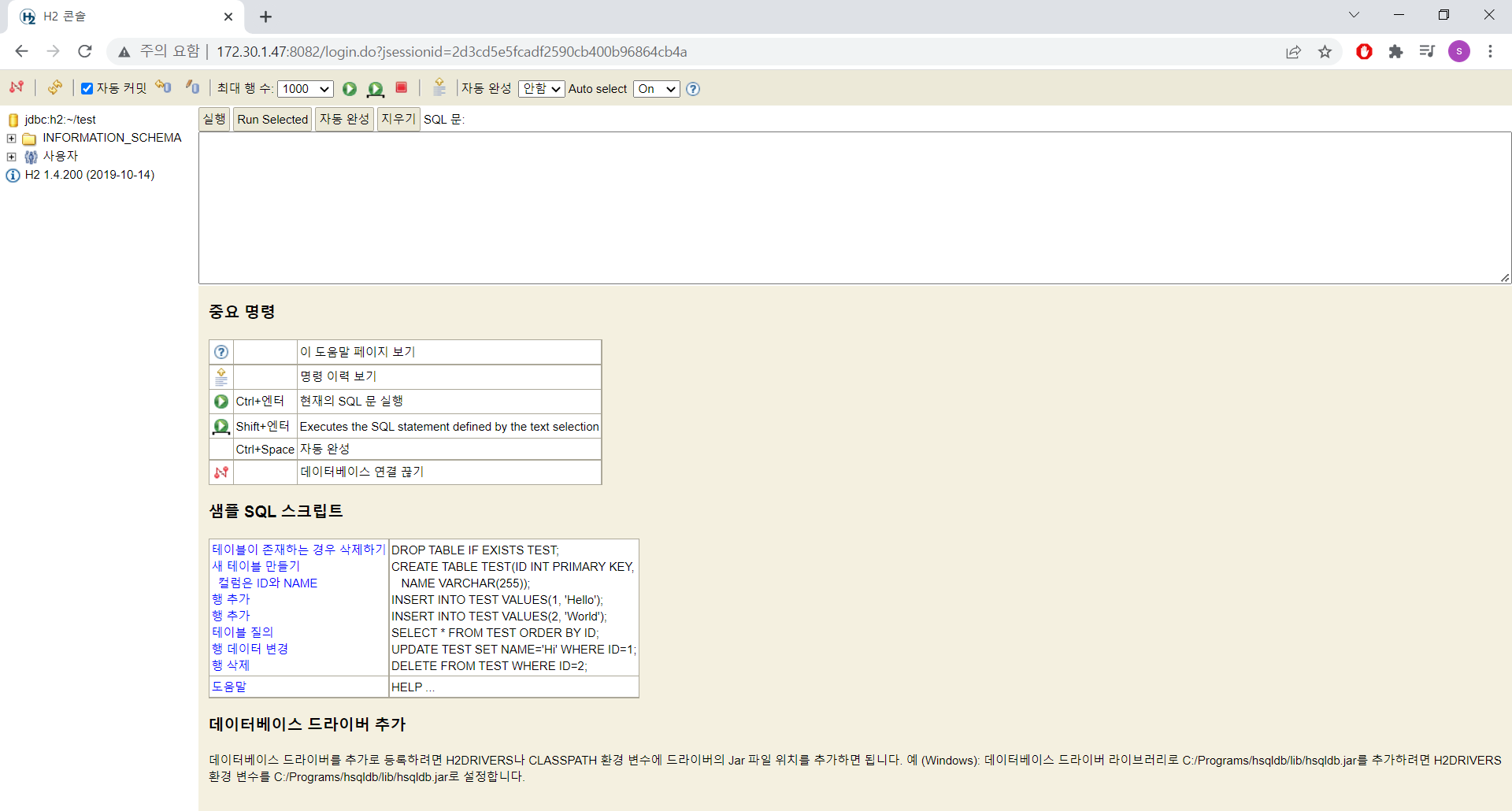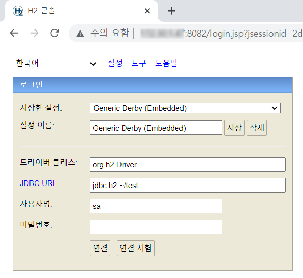 JDBC URL을 jdbc:h2:~/test처럼 접근하면 애플리케이션과 웹 콘솔이 동시에 접근하면 오류가 발생할 수 있다.
