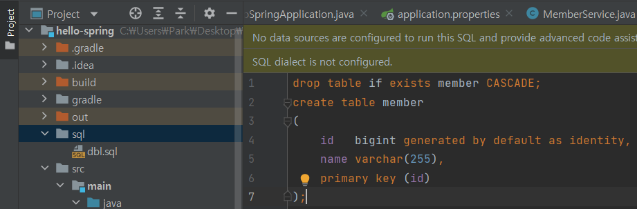 sql 폴더를 생성하여 dbl.sql 파일에 sql을 관리.