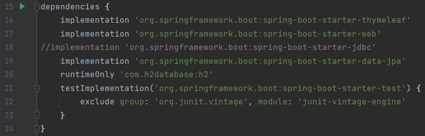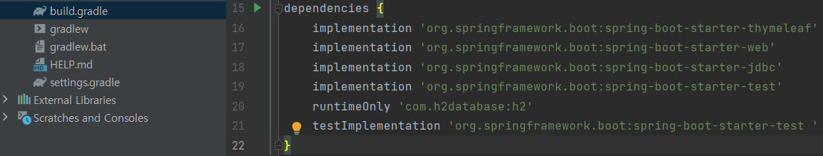 build.gradle 파일에 jdbc, h2 데이터베이스 관련 라이브러리 추가