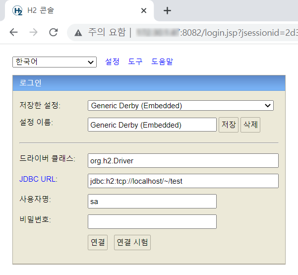 JDBC URL을 jdbc:h2:tcp://localhost/~/test와 같이 바꿔서 연결한다.