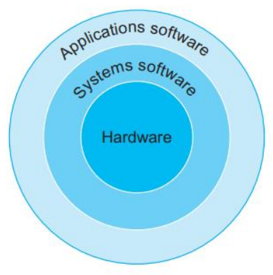 그림과 같이 응용 프로그램이 가장 바깥쪽에 위치하며, 여러 시스템 소프트웨어가 하드웨어와 응용 소프트웨어 사이에 존재한다.