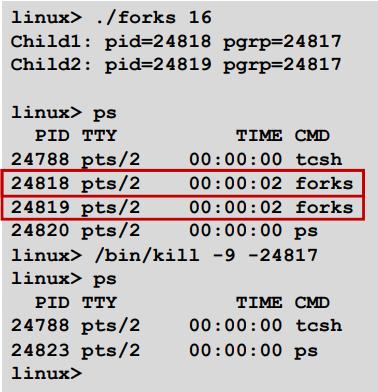 명령어는 signal 9(SIGKILL)를 프로세스 24818로 전송한다. PID가 음수이면 pgid의 모든 프로세스로 신호가 전송된다.